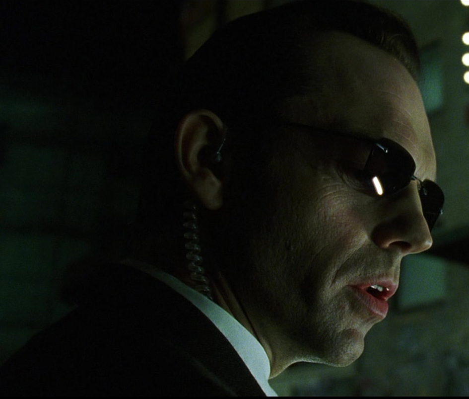 Agent Smith with both his sunglasses and earpiece removed.