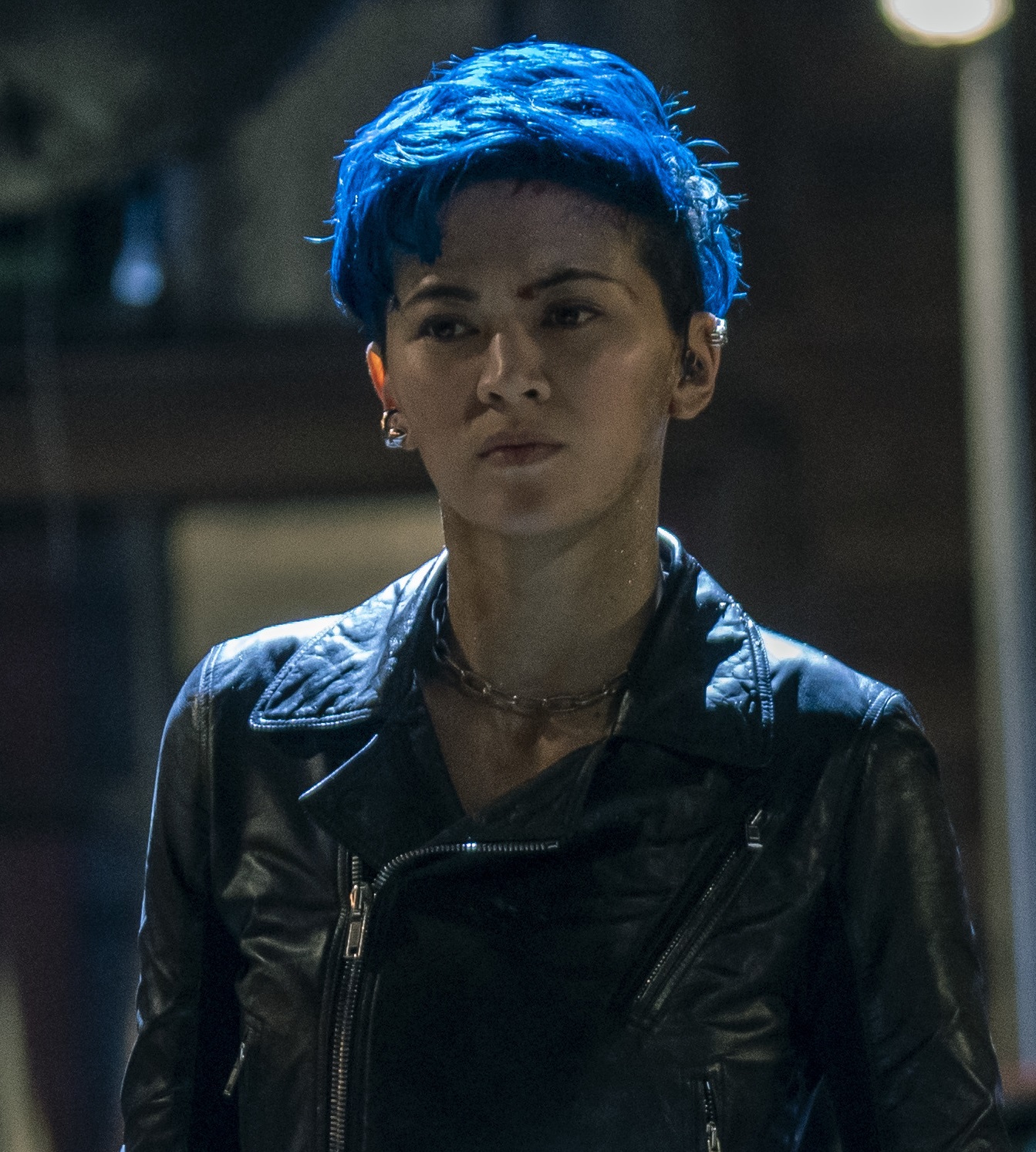 - Jessica Henwick said that when Lana Wachowski first described the role to her, one of the requirements was that she'd have to shave her head bald - apparently because Bugs' RSI in the Matrix itself was bald, not just as flashbacks to when she was freed from the pods, so she'd have to be bald for the entire film shoot (i.e. Keanu Reeves and Carrie-Anne Moss both had to shave their heads at the end of filming to do their pod scenes). Henwick agreed, rationalizing that she might be able to argue down Lana at some later point; after she was hired they had further discussions and this eventually led to Lana coming up with Bugs' final look of short, blue-dyed hair.